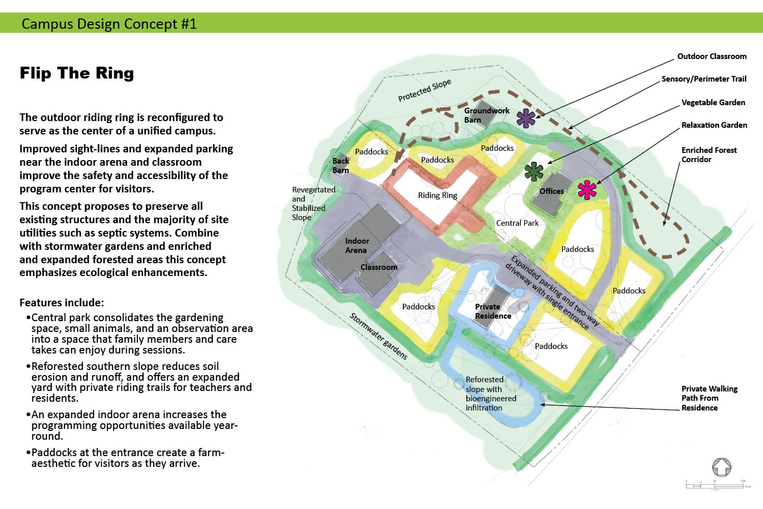 Expanding opportunities for ecological restoration, program elements, and safe circulation by integrating new land into an existing therapeutic riding campus.